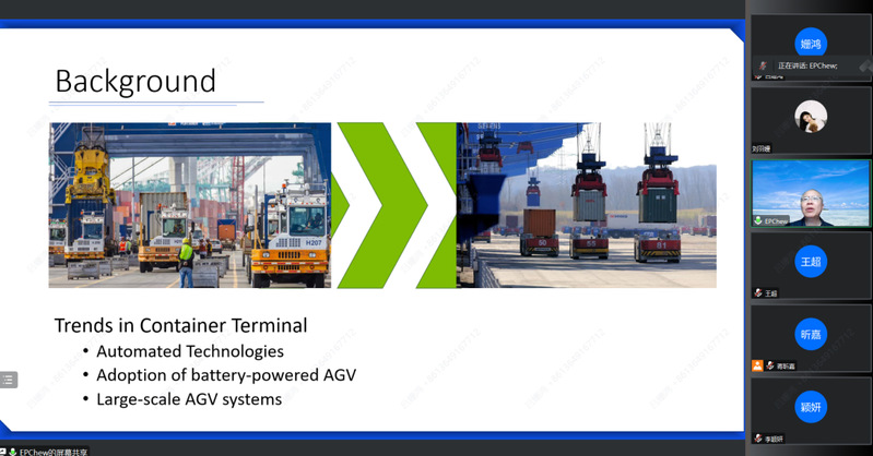 报告主要从四个方面展开:首先,Chew Ek Peng基于港口逐渐低碳化、自动化和数字化的趋势和港口电池驱动的AGV的广泛应用,阐述了大型集装箱码头AGV充电调度问题的产生背景及主要挑战。接着,Chew Ek Peng讲解了通过Multi-Agent Q learning(MAQL)方法来解决大型集装箱码头的充电调度问题,其目标是提供一个能使工作延迟最小的充电计划,从而提高码头整体的装卸效率。随后,Chew Ek Peng介绍了采用MAQL方法在不同情景下进行数值实验的过程,并将实验结果与另外几种方法对比,发现MAQL方法的表现明显优异,指出该方法在充电调度问题实际应用中的可行性。