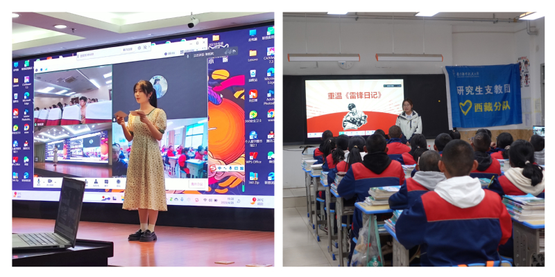 “粗缯大布裹生涯,腹有诗书气自华”,主持人王雨晴用娓娓道来的古代诗词引出读书之用。随后,我校第二十四届研支团西藏分队队长、正支教于堆龙德庆区中学的李润娜老师,与两地同学们分享了《雷锋日记》这本书,介绍雷锋语录的同时,也向我们讲述她眼中的雷锋精神和她的志愿服务经历。