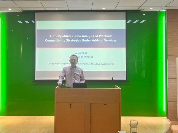 5月12日下午,加拿大温莎大学Odette商学院李武(Kevin W. Li)教授受学院智能决策与风险分析研究所邀请,在南航将军路校区经管学院702会议室作题为“A Co-Opetitive Game Analysis of Platform Compatibility Strategies Under Add-on Services”的讲座。我院教授徐海燕、教授陈克兵、副教授何沙玮、副教授王敏等教师及部分硕、博研究生现场聆听了李武教授的报告分享,本次学术报告由徐海燕教授主持。