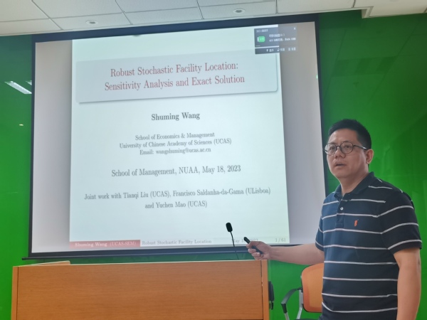 中国科学院大学王曙明教授为我院师生作题为“Stochastic Robust Facility Location: A Nested Decomposition Approach”的学术报告。报告将鲁棒随机优化下的设施选址问题作为问题背景进行展开,区别于以往研究,他采用了一个状态模糊集来模拟与不同状态下的需求相关的分布不确定性,在此基础上建立考虑多种需求状态下的选址模型,并从两个方面对模型进行敏感性分析。他提出了一种嵌套的Benders分解算法来求解模型,其创新性地利用了最坏分布情况下的预期第二阶段成本的子梯度。王曙明主要从事鲁棒优化与随机规划研究及其在选址与物流网络优化、供应链风险管理、库存与收益管理、健康医疗管理等领域的应用。研究成果分别发表于Production and Operations Management、INFORMS Journal on Computing、Transportation Science等顶级期刊。