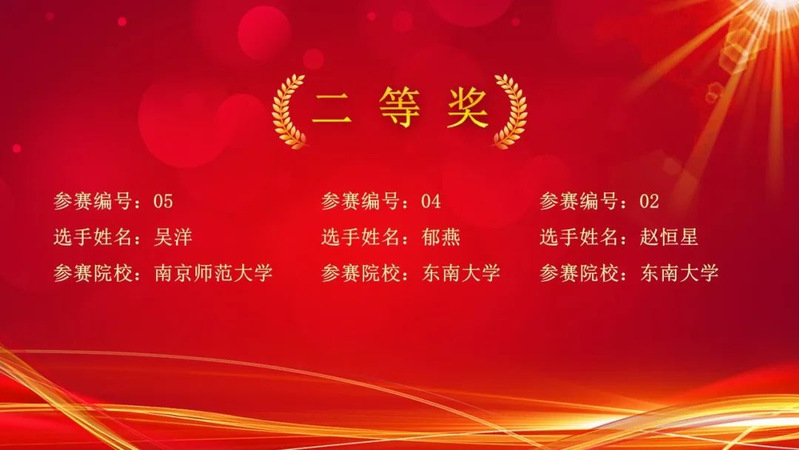 最后,在大家的共同见证下,颁奖盛典正式公布个人荣誉奖项和团队荣誉奖项获奖名单。南京师范大学王子豪、必威西汉姆联孙旭荣获一等奖;南京师范大学吴洋、东南大学郁燕、赵恒星荣获二等奖;南京师范大学徐良笑、东南大学陈俊峰、南京大学赵一定、必威西汉姆联李冬美、南京信息工程大学张佳山荣获三等奖。南京师范大学获得团队一等奖,东南大学获得团队二等奖,必威西汉姆联获得团队三等奖。