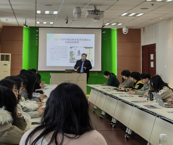 胡苹以生动的事例向同学们展示了中华优秀传统文化中的“廉”。随后她从逻辑起点、哲学依据、思想根源和价值取向四个方面剖析了廉洁文化中的主要哲学观,最后从价值层面、思想层面、行为层面、作风层面终点阐述了廉洁与耻辱、功德与私德、自律与他律、勤俭与奢侈这四对关系。
