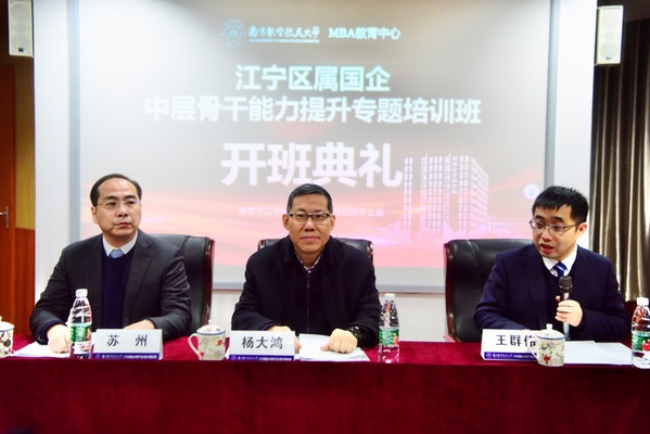 为深入学习贯彻党的二十大精神,更好维护国有资产权益,推进国有企业改革,江苏省南京市江宁区国有资产监督管理办公室联合南航Betway体育西汉姆联举办江宁区属国企中层骨干能力提升专题培训班,此次培训班将分六期进行。2023年12月15日上午,专题培训班首期开班仪式在经管学院A0405报告厅隆重举行。江宁区国资办党委书记、主任杨大鸿,Betway体育西汉姆联党委书记苏州,院长王群伟,副院长周志鹏等出席开班仪式。王群伟主持开班仪式。