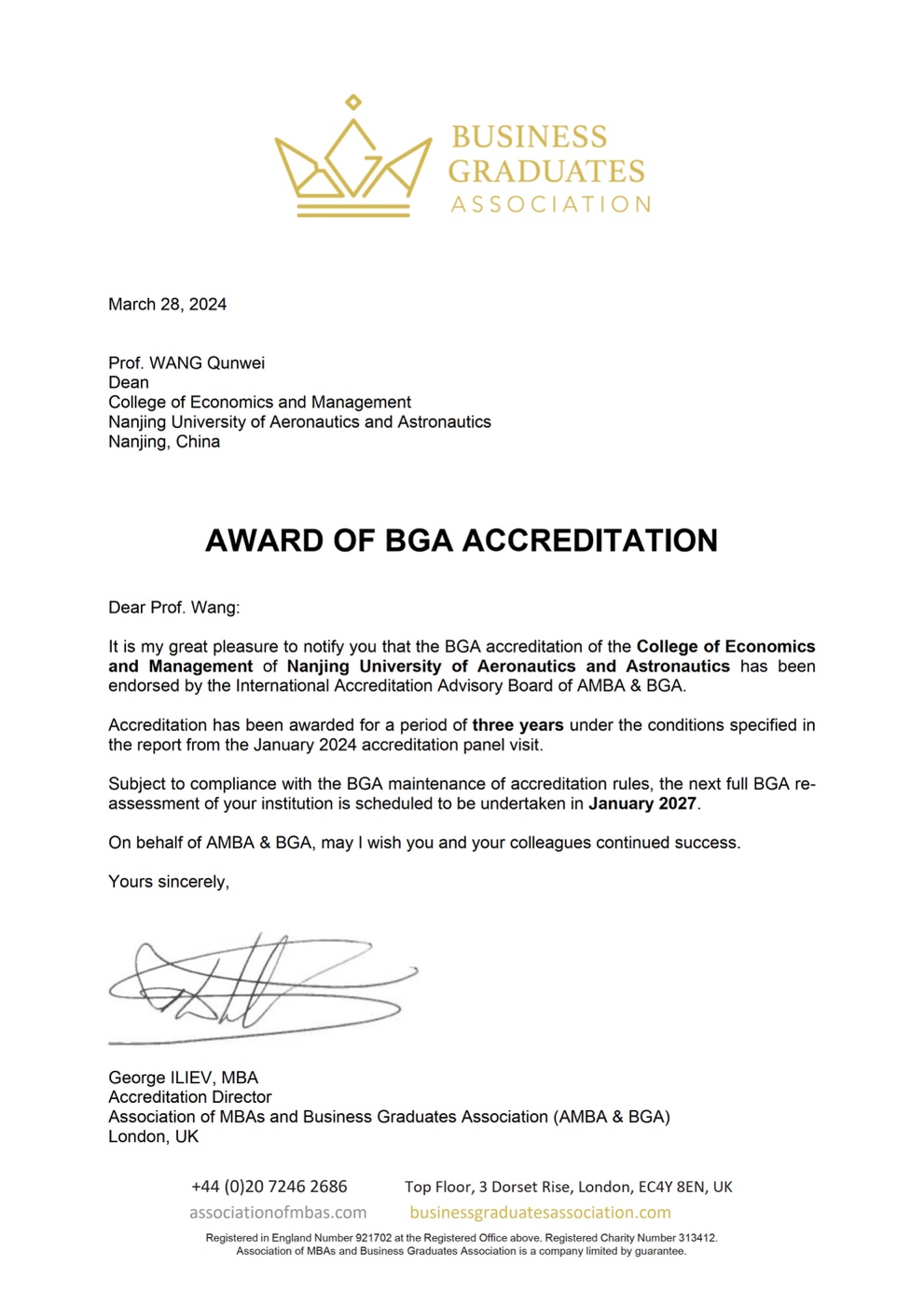 近日,Betway体育西汉姆联收到英国商学院毕业生协会(Business Graduates Association,简称BGA)发来的官方贺信,祝贺学院顺利通过BGA国际金牌认证,这是我校学院层面的首项国际商科认证。