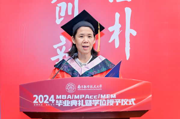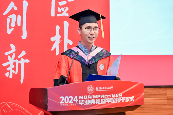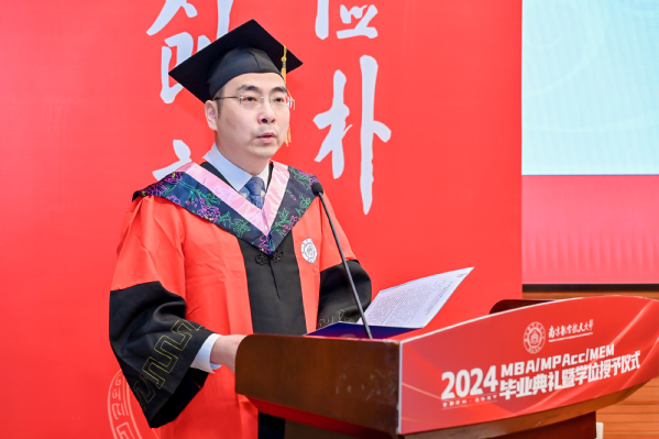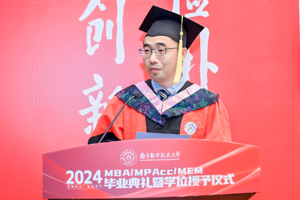 学位授予仪式之后,经管学院党委书记苏州代表学院寄语全体毕业生。苏州书记表示,2024年是特殊的一年,同学们毕业之年恰逢学院建院40周年,学院锐意改革、勇于攀登,实现了创业起步、快速发展、全面腾飞三个阶段的跃升,目前正步入更高质量发展的新阶段;2024年是喜悦的一年,学院通过BGA国际认证,标志着学院教育质量和办学水平得到国际认可,以商学院国际认证为牵引的可持续发展机制正在加快形成;2024年是改革的一年,学院正在推进非全研究生教育改革,思考和践行如何完善培养方案与课程体系,如何更好地产教融合、让学生更深入了解中国的商业实践和商业环境,如何发挥南航的多学科优势、开设更多“科技+商业”特色班,如何扩大与国外高水平商学院合作、为学员提供更多国际化体验;如何改善办学条件为同学们提供更优良的学习环境;如何建设学院的校友平台、更好发挥校友作用、更好为校友服务。苏书记希望2024届毕业生,珍惜南航之缘、师生之情、同窗之谊,与母校母院情感与共、发展与共、荣辱与共,在追求理想、成就事业的同时,继续关心母院的建设发展,支持母院、宣传母院。最后,他向毕业生发出诚挚的邀请,建院40周年之际,欢迎大家常回家看看,携手出发共创永续发展!