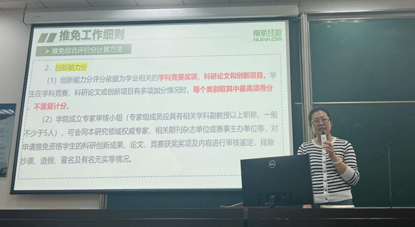 学院教学办主任田苑娜以2024届为例,向同学们进行《本科生推荐免试攻读硕士学位研究生工作细则》详细解读。她希望同学们对自己的人生发展做出合理布局,主动提升自己的规划意识。