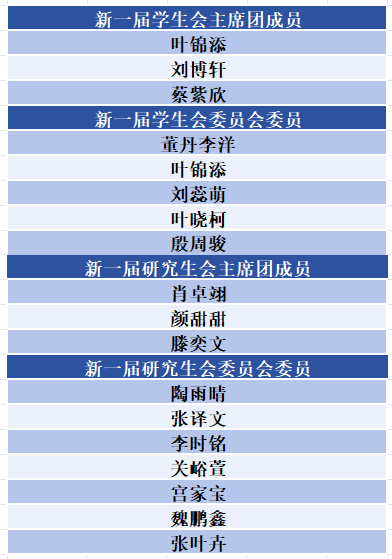 大会圆满完成各项既定任务,通过民主投票差额选举产生了叶锦添、刘博轩、蔡紫欣为新一届学生会主席团成员;肖卓翊、颜甜甜、滕奕文为新一届研究生会主席团成员;董丹李洋等5位同学为新一届学生会委员会委员;张叶卉等5位同学为新一届研究生会委员会委员。