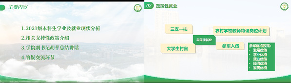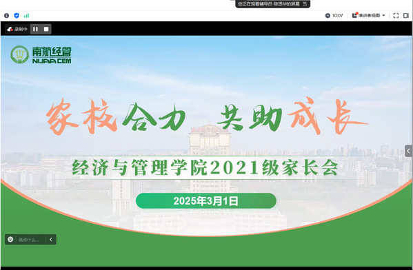 本次线上家长会中,辅导员陈思华详细汇报了毕业生学业及就业现状,通过对比往届升学率、就业率等指标,结合2025届学生考研初试成绩、已签约人数等数据,剖析当前学业难点与存在问题;同时聚焦政策性就业,向家长阐述不同路径的发展优势。
