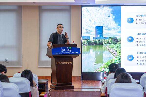 第十四届MBA/MEM/MPAcc联合会主席漆金刚介绍了联合会的组织架构和丰富多样的品牌活动。他分享了自己的学习经验和社团活动参与心得,为新生们适应校园生活提供了建议。
