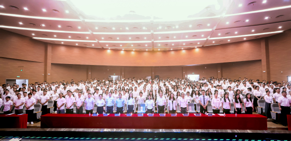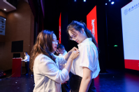 学院副书记胡苹,副院长查冬兰、欧阳林寒为三位新生代表佩戴校徽,全体新生共同宣读入学誓词,一起向学校许下遵循南航校训校风的庄严承诺。
