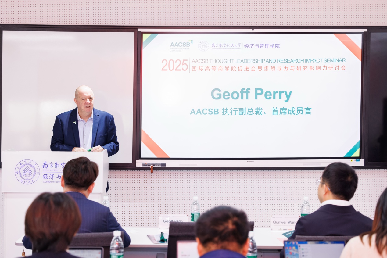 Geoff Perry对南航经管学院承办此次研讨会以及参会商学院代表们的支持表示感谢。Geoff Perry认为,AACSB认证为全球商学院提供了一个战略框架,助力院校明确使命、规划愿景。他强调认证价值不仅在于最终获得的认可,更在于整个认证过程中的持续改进与提升,这一过程帮助院校在既定方向上不断优化,实现高质量发展。此外,Geoff Perry介绍了AACSB在全球的布局及其对亚太地区,尤其是中国商科教育的重视。他表示,AACSB致力于与中国商学院紧密合作,通过认证、会员服务及全球网络,共同推动商科教育的创新与发展。