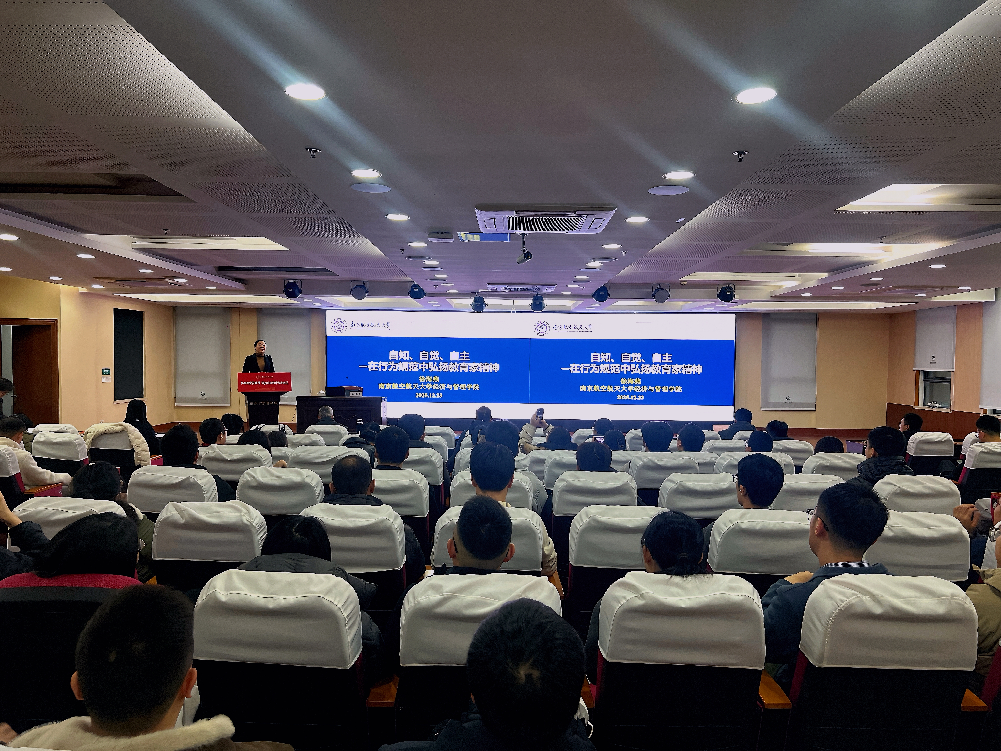 今年,学校根据教育部《新时代高校教师职业行为十项准则》等有关规定,结合社会主义核心价值观、教育家精神、“四有”好老师标准以及学校精神文化,制定并发布了《必威西汉姆联教师行为规范(试行)》。12月23日,“弘扬教育家精神,践行南航教师行为规范”系列宣讲活动在Betway体育西汉姆联举行。2025年江苏教师年度人物、国务院政府特殊津贴专家、Betway体育西汉姆联徐海燕教授,结合41年从教经历,从“自知、自觉、自主”的三重追求展开,分享育人感悟,讲述南航教师行为规范的精神内核。讲座由人力资源部/党委教师工作部副部长张晓燕主持,百余名教师参会。